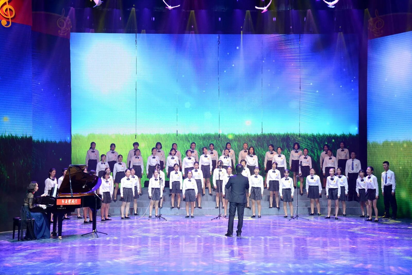 活动现场文艺演出《启程》:厦门市第二中学的合唱团在钢琴的伴奏下,唱响对未来的期待,让歌声启程飞翔在辽阔的天空,让歌声启程奔向光辉的日月。