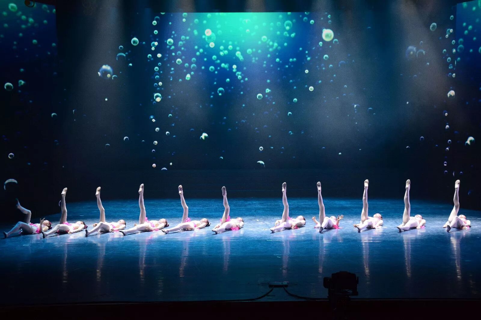 活动现场文艺演出《“泳”往直前》:以蓝为底色,小朋友们像大海里的鱼儿,整齐划一地舞动着,活泼灵动。