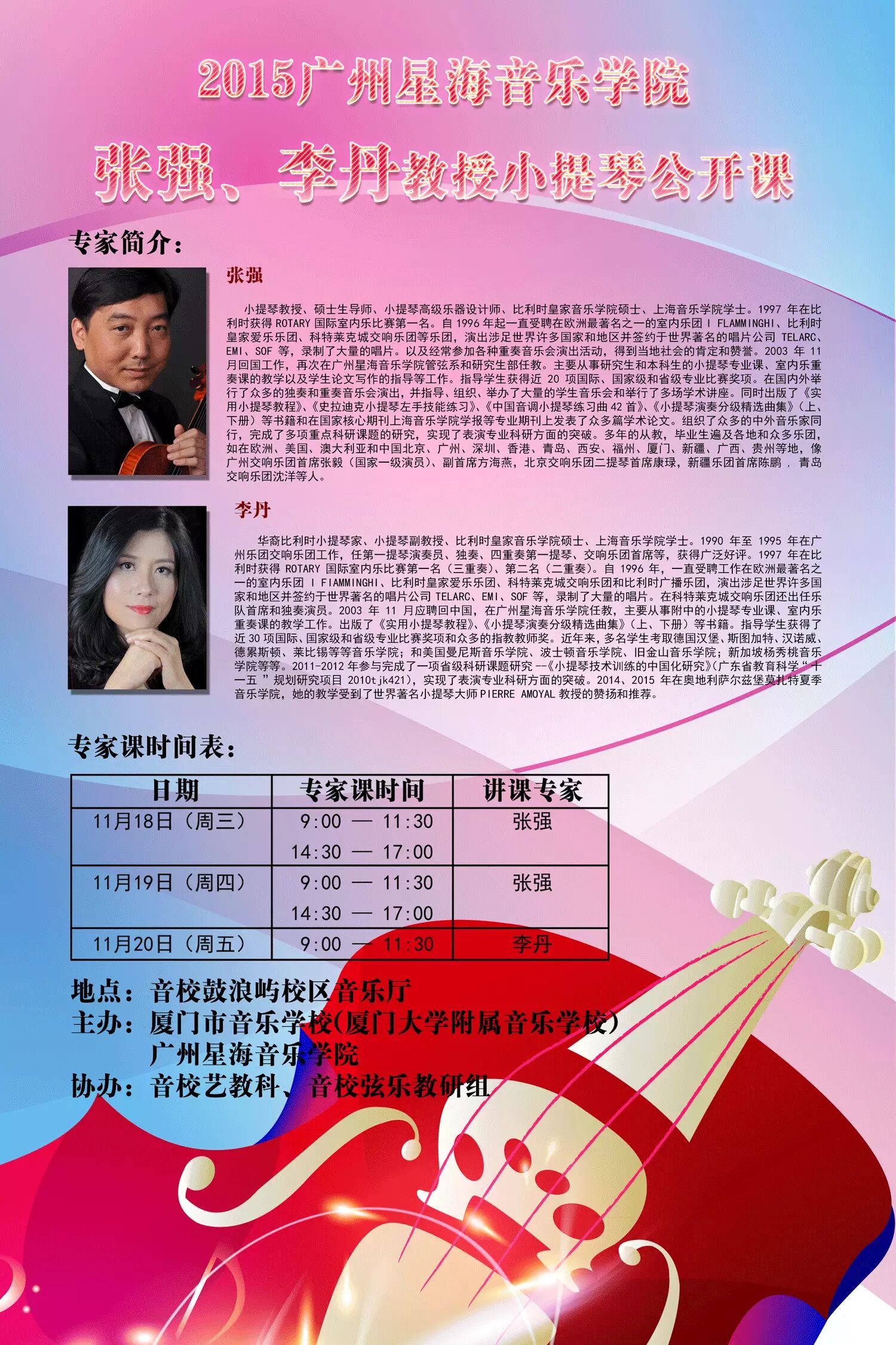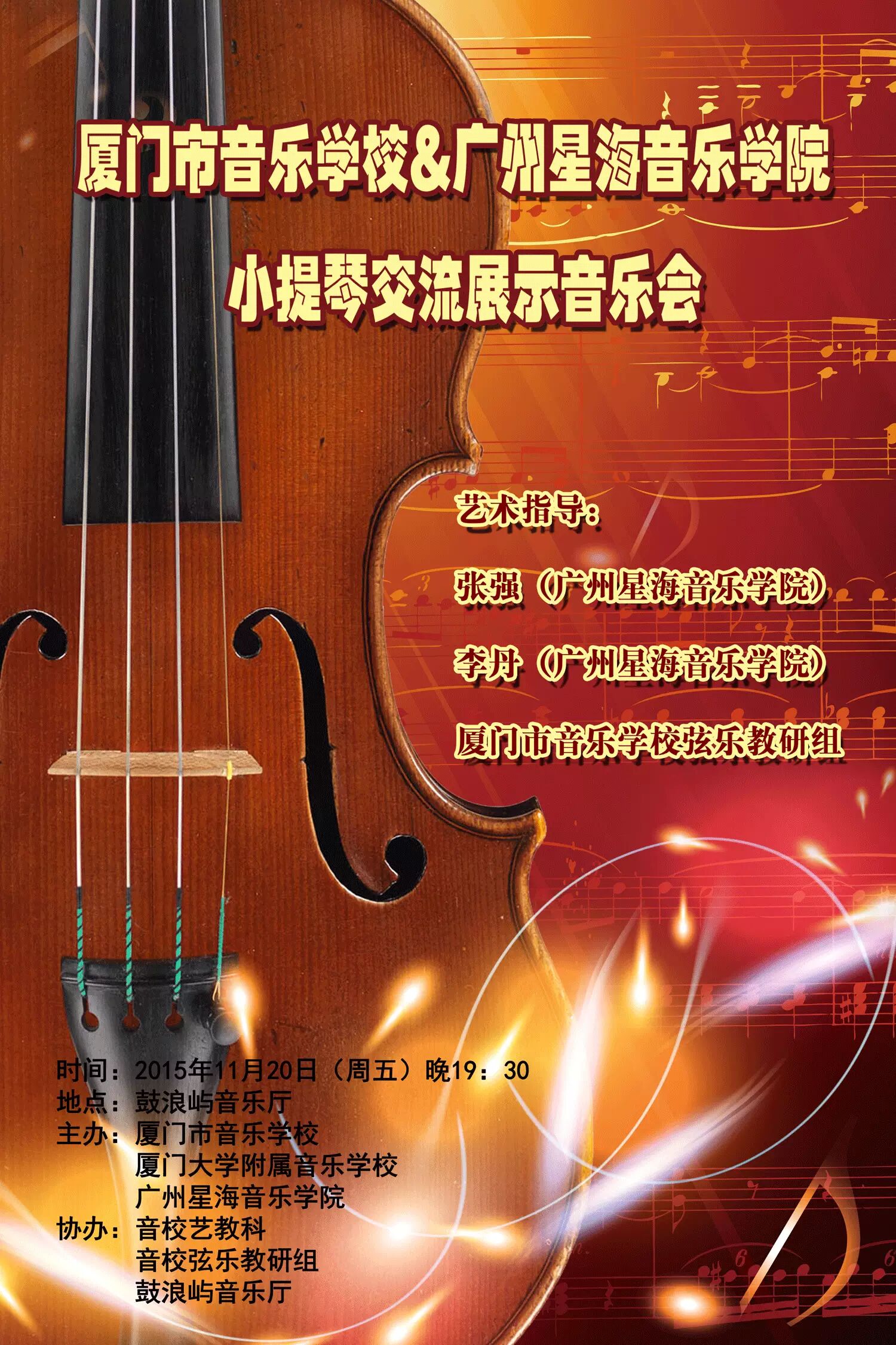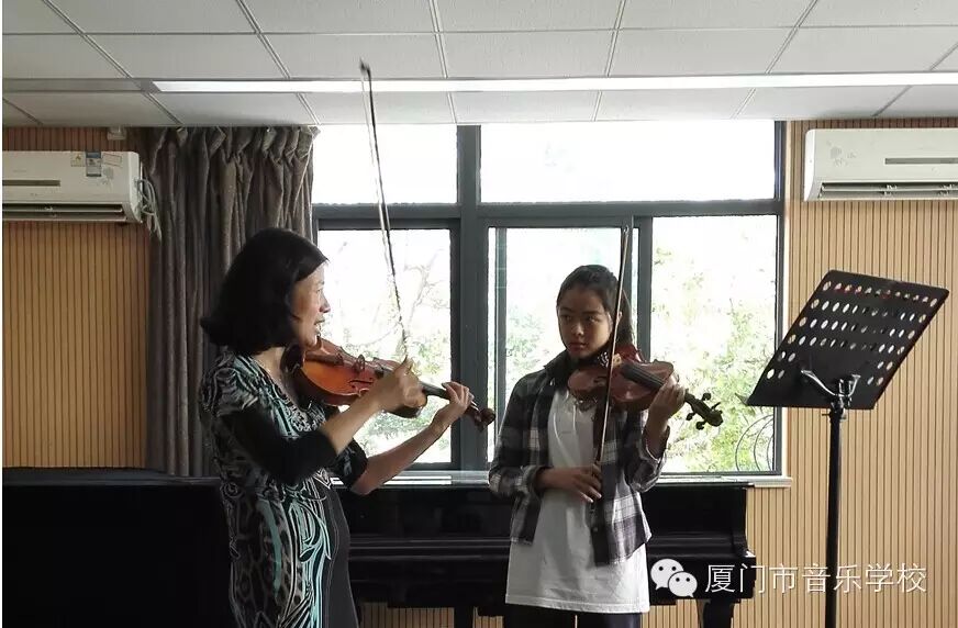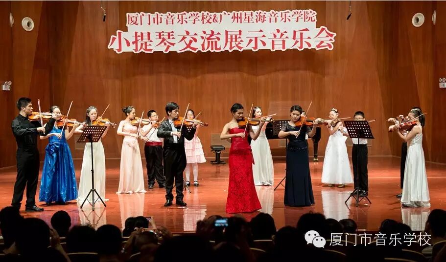 由我校与广州星海音乐学院共同举办的小提琴交流活动于2015年11月18日正式开幕。广州星海音乐学院管弦系小提琴教授张强先生、李丹女士于11月18日至11月20日莅临我校举办了为期三天的小提琴大师班。11月20日晚,张强教授与李丹教授带领的三位广州星海音乐学院附中学生与我校学生共同举办了小提琴交流展示音乐会。厦门市教育局赖菡局长也出席了本次音乐会,音乐会获得圆满成功!