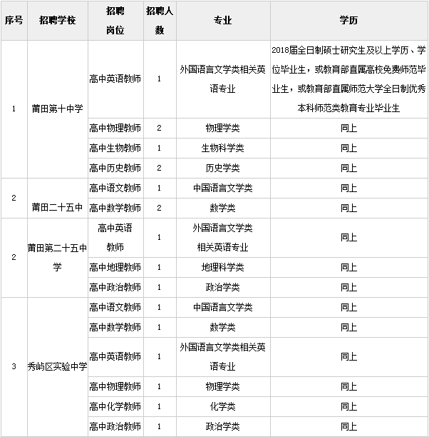 2018福建莆田市秀屿区招聘高中新任教师18人