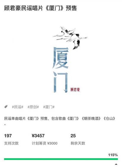 六月中旬,顾君豪众筹的唱片《厦门》准备要发货了。