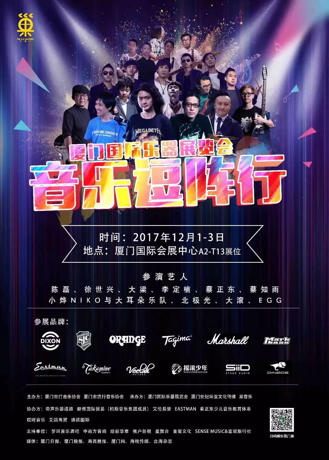唐朝乐队吉他手陈磊、鲍家街43号乐队吉他手蔡正东与蔡知雨、大牌明星合作鼓手:大梁、李定楠、徐世兴等各路音乐大师将莅临现场、全方位音乐人NIKO小烨与大耳朵乐队、福建老牌摇滚乐队北极光、少儿乐队EGG乐队、民谣歌手大滚齐助阵。