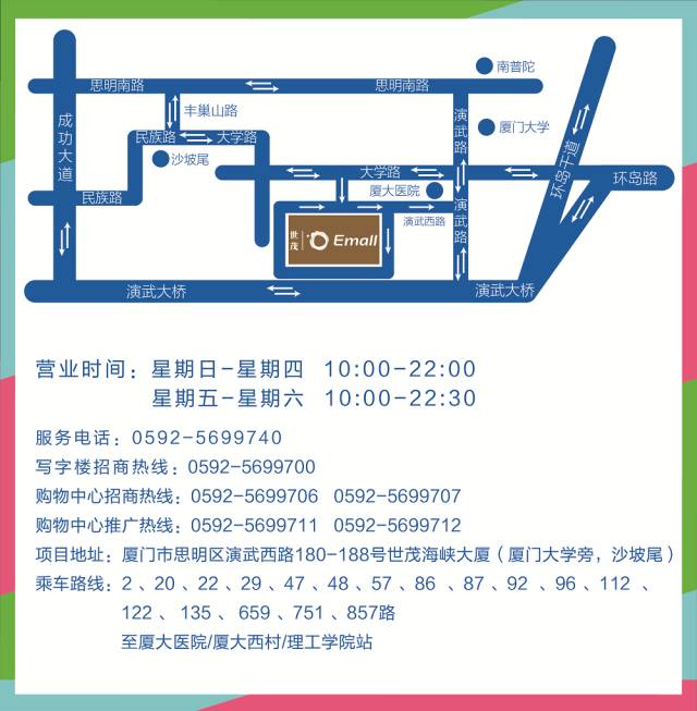 厦门世茂Emall位于高达300米的厦门新地标——世茂海峡大厦双塔之间,地处厦门市思明区厦港街道,东临厦门大学,西与鼓浪屿隔海相望,北靠万石山植物园,南面临海,面朝厦门演武大桥观景平台。