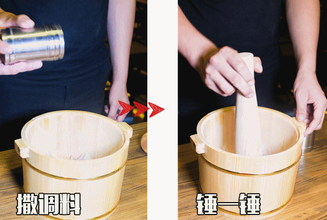 吃这道菜有讲究,要先用特制调味料给鸡肉按摩按摩。花生+黑豆,均匀撒上之后,还要用木槌轻轻捶下,将鸡肉捶松,更入味好吃。