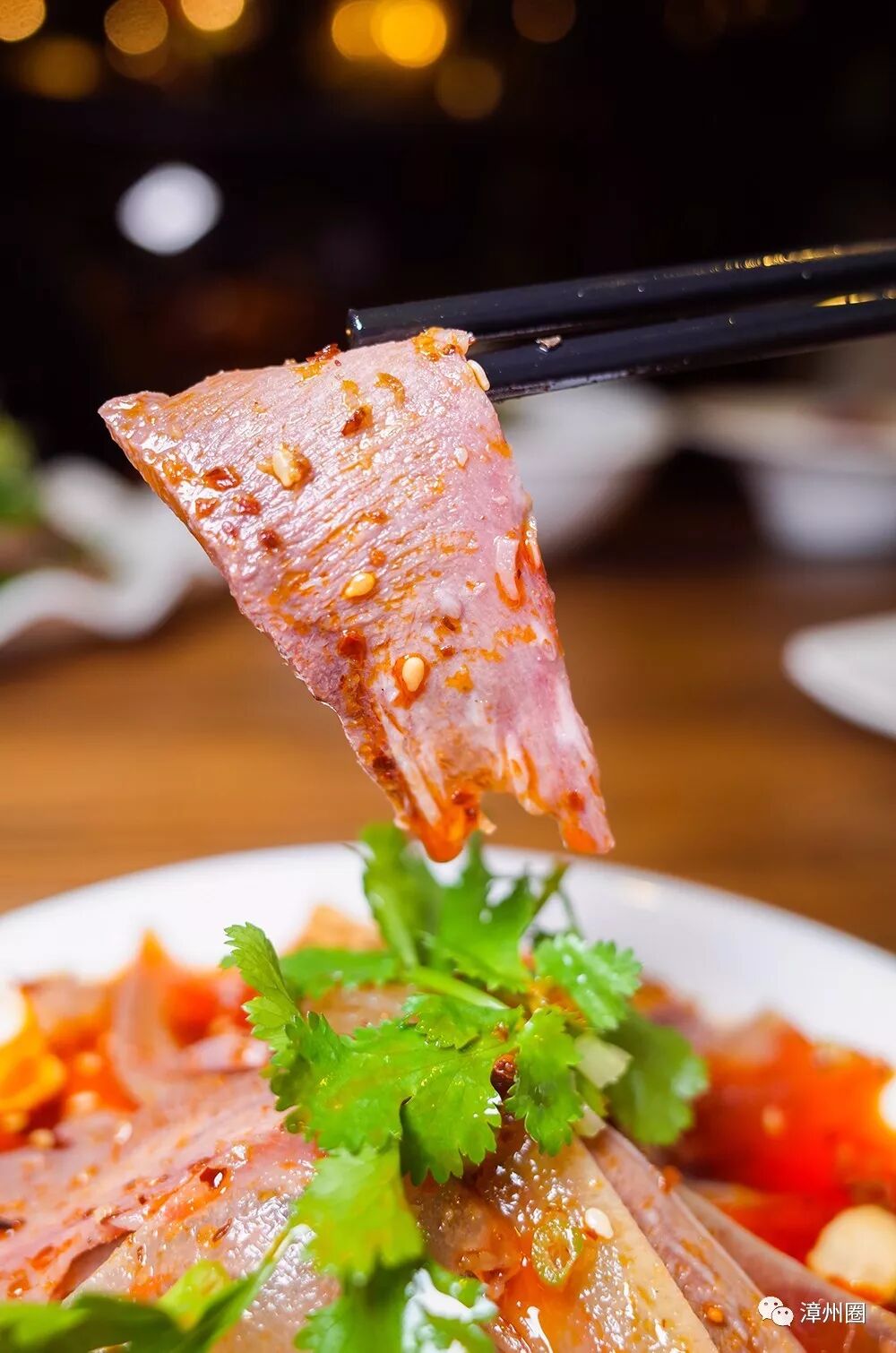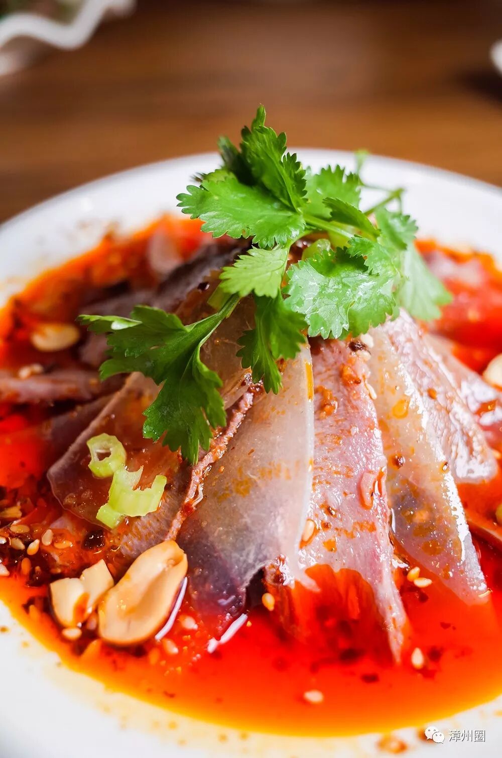 牛肉先卤后切片,再浇上川味辣油,辣椒仔都挂在肉片上,风味最佳!
