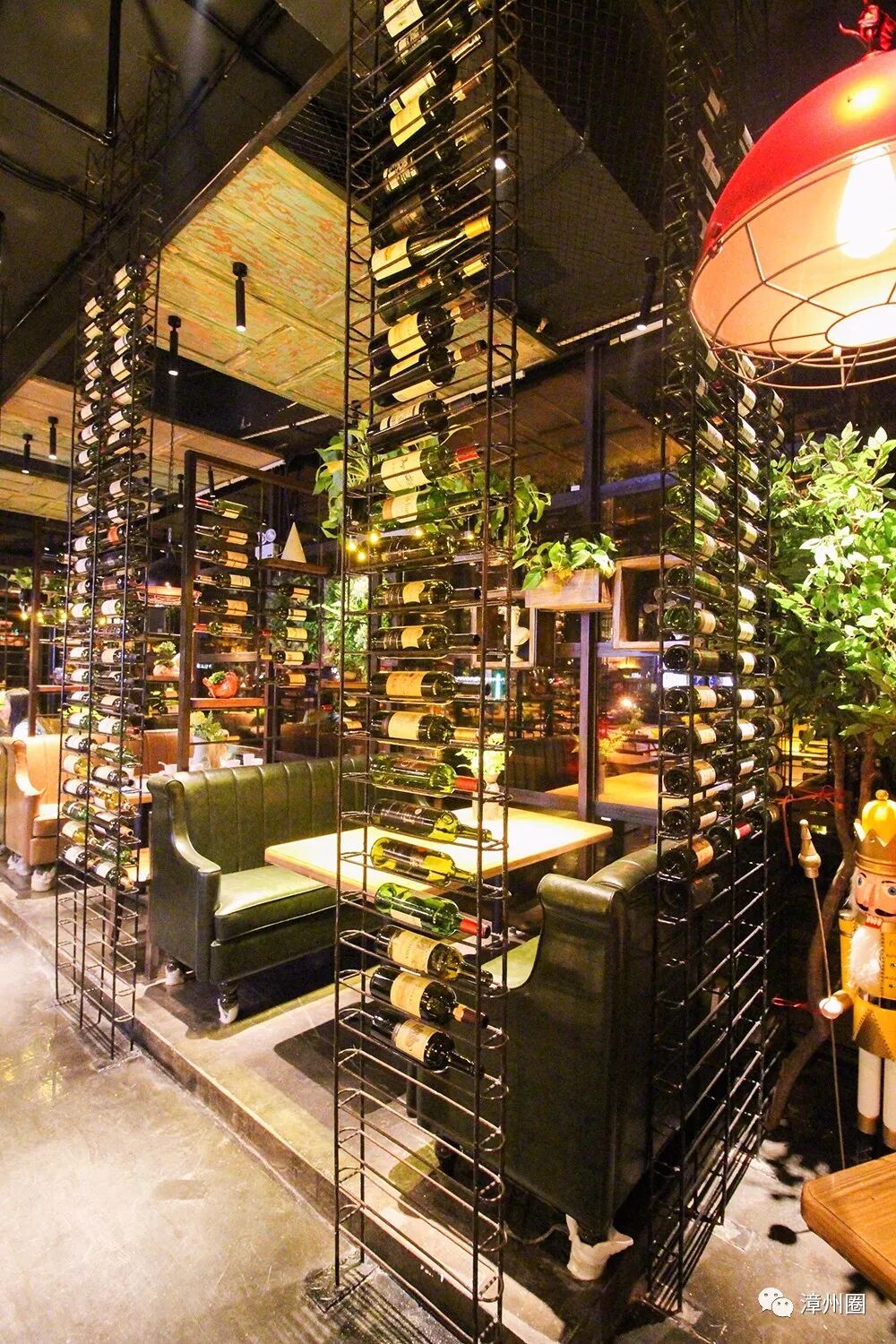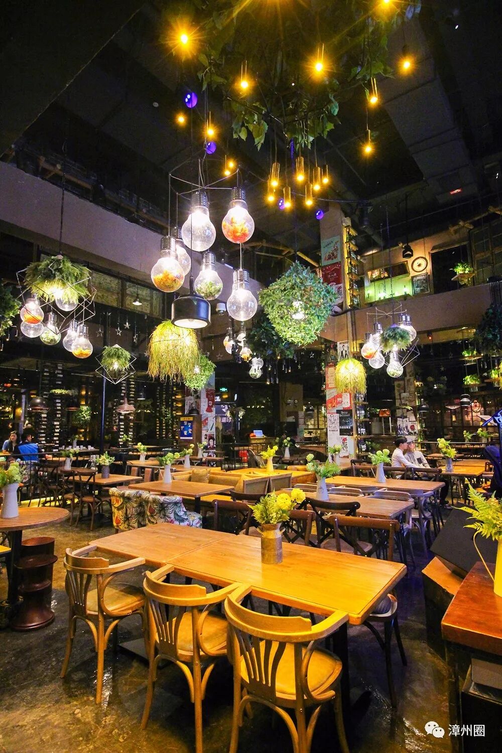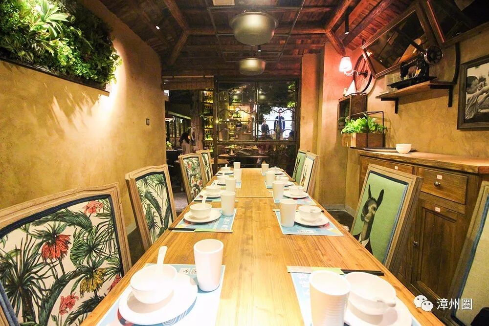 处处都被植物装扮,仿佛一个花园餐厅,连吊灯都能映出花草的影子,令人仿佛置身于爱丽丝梦幻仙境中。