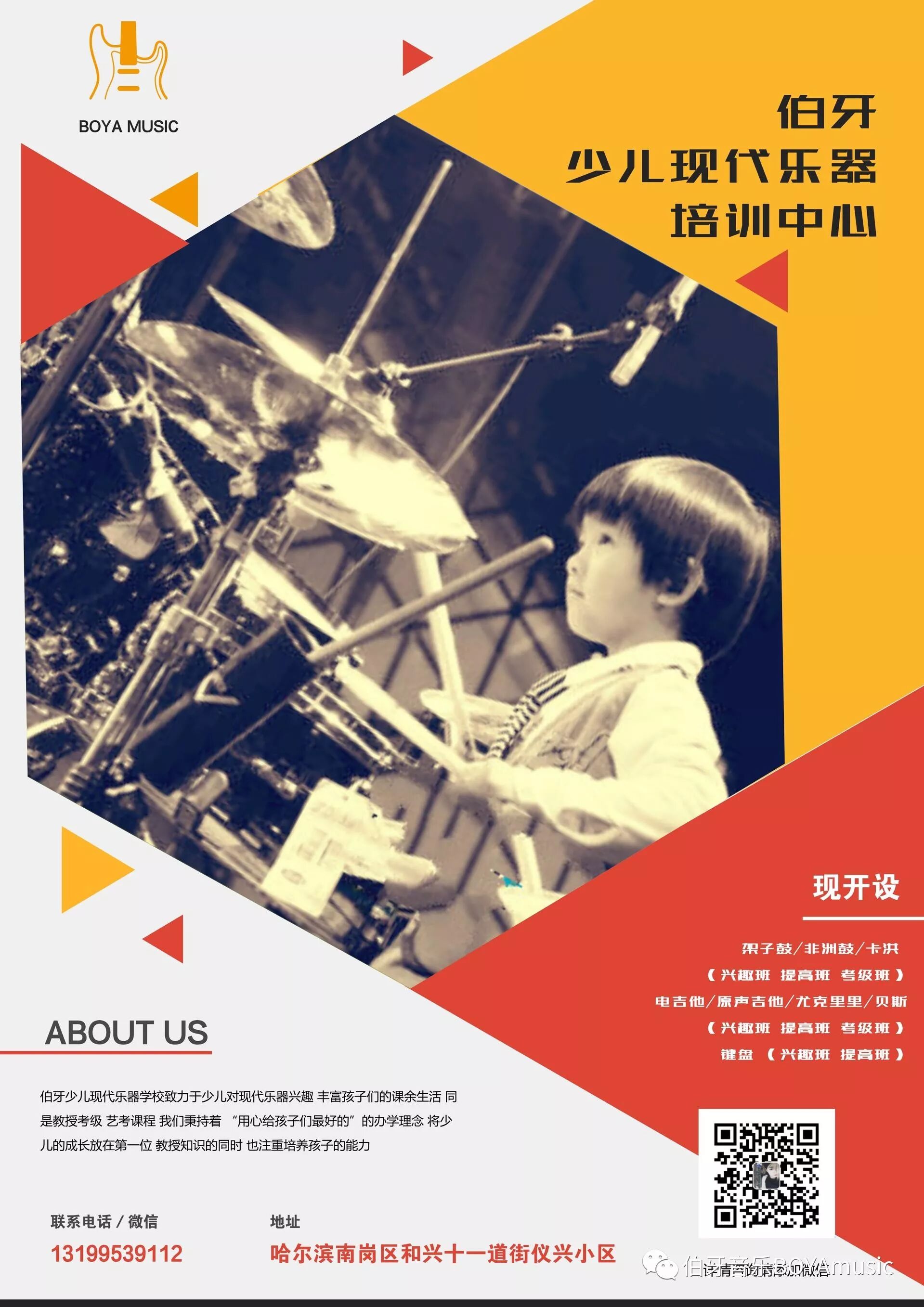 我们现开设少儿架子鼓、原声吉他、尤克里里、电吉他、贝斯课程。分为,兴趣班、提高班、考级班(艺考班)。由来自哈尔滨师范大学,北京迷笛音乐学院,哈尔滨工业大学的的几位专业老师任教。