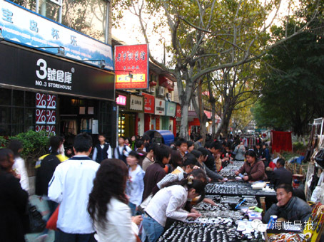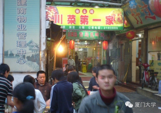 八十年代初,学生街上的店铺由厦大校方租赁给商家,或由商家承包去经营,校方负责“一条街”上的一些卫生、安全的管辖问题。从一条街的店铺变化上,还可看到中国的经济走向。最早的时候,占据一条街的是酱油厂、饮食业公司等国营单位的门市部,接着,是个体经营的时代。有一阵子,一条街上曾有家简陋的理发店,深受欧美外教的青睐;还有一段时间,一条街是台湾客商的“登鹭”地点,有三家店的老板都是台湾人,林家鸭庄,还有为一条街带来“套餐”餐饮观念的温莎堡。